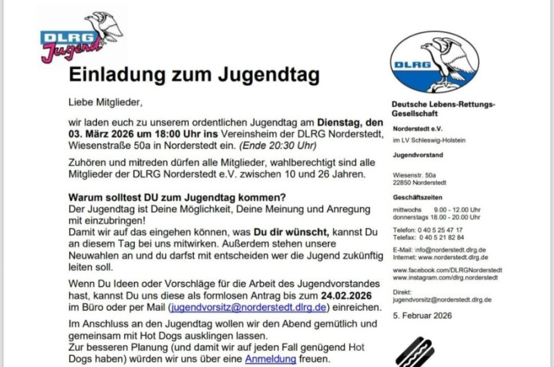 Am 03.03.2026 wird durch DLRG Norderstedt e.V. im Fachbereich Jugend die Tagung Ordentlicher Jugendtag 2026 für jeden angeboten. Angesprochen sind insbesondere Mitglieder der DLRG Norderstedt im Alter von 10 bis 26 Jahren. Die vorläufige Tagesordnung findet ihr in der angehängten Einladung zum Jugendtag.