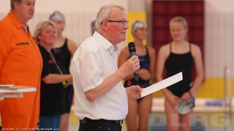 Oberbürgermeisterin Elke Röder eröffnete mit ihrer Rede im Schul- und Vereinsschwimmbad die Grußworte und hob die wichtige Arbeit der DLRG hervor. Weitere Grußworte gab es vom DLRG Landesverband Schleswig-Holstein durch den Vizepräsidenten Andre Tschirner und dem Jugendvorsitzenden des Landesverbandes Tom Matzen. Sie nahmen auch die besondere Ehrung für Dietmar Stein, eines unserer Gründungsmitglieder, für seine sechzig Jahre Mitgliedschaft im Verein vor.Anschließend zeigten aktiven Vereinsmitglieder*innen im Schwimmbad ein kurzweiliges Programm aus verschiedenen Bereichen unserer Arbeit. Aber auch schon vor dem offiziellen Teil konnten sich alle über unsere Fahrzeuge, Gerätschaften und die Historie der DLRG Norderstedt im und vor dem Vereinsheim informieren.